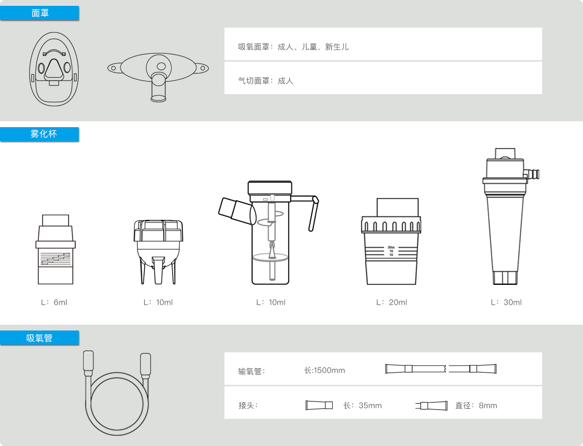 2. The product comprises oxygen tubing, a nebulizing cup, a nebulizing mask, a tracheotomy mask, corrugated tubes, rotatable connectors and an air filter, and is individually packaged.